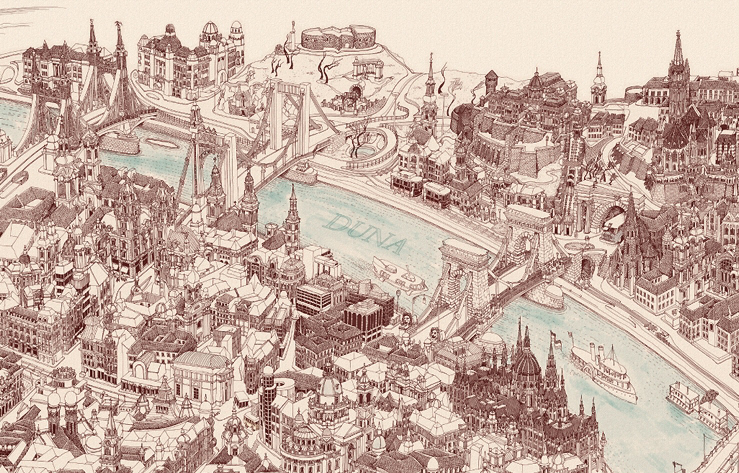 Very detailed freehand pen and ink Bird's Eye View Map of Budapest, Hungary. This perspective map presents the citiy in an unusual way: it was drawn with a single technical pen. The Perspective Map of Budapest has many things for you to discover and to marvel about for hours, weeks or even months. It draws up questions in the viewer, it raises interest and arouses desire to check out all the actions depicted in the picture.