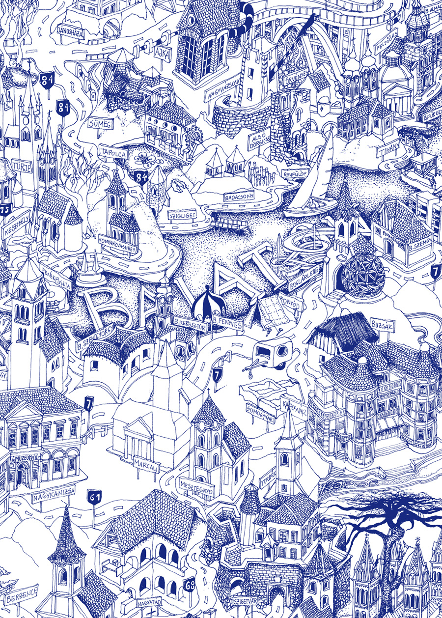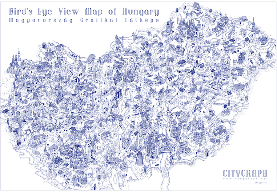 Very detailed freehand pen and ink Bird's Eye View Map of Hungary. This perspective map presents the country in an unusual way: it was drawn with a single technical pen - today I work with digital pen. The Perspective Map of Hungary has many things for you to discover and to marvel about for hours, weeks or even months. It draws up questions in the viewer, it raises interest and arouses desire to check out all the actions depicted in the picture.